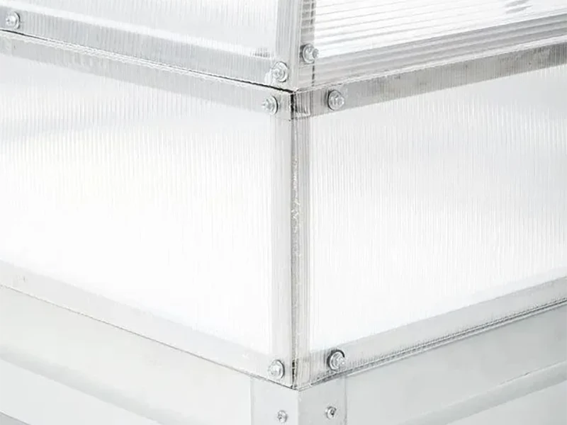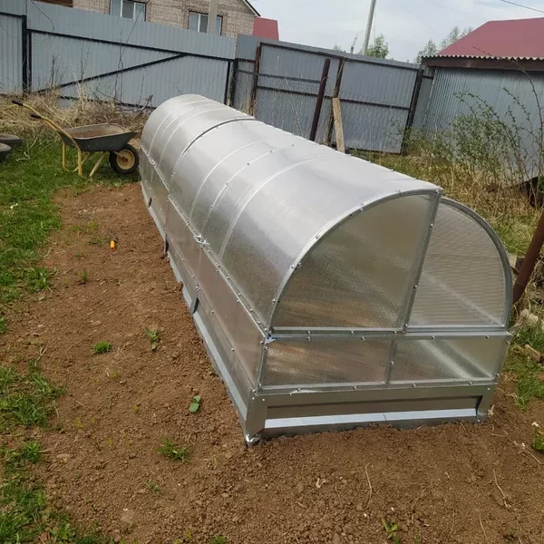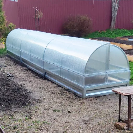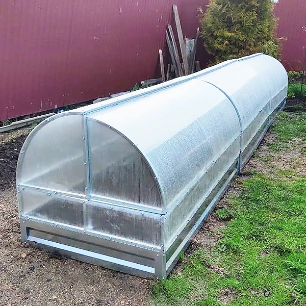 Каркас парника выполнен из оцинкованной трубы с размером 20*20 мм, что обеспечивает прочность и долговечность конструкции. Поликарбонатные стенки сделаны из 14 выкроенных деталей, что обеспечивает хорошую защиту от внешних условий.